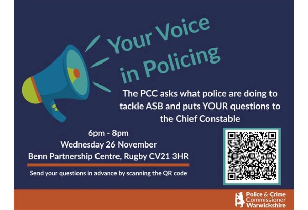 Join us for Your Voice In Policing, a new community event where your views and questions can help shape local policing and community safety. π Location: Benn Partnership Centre, Railway Terrace, Rugby CV21 3HR Hear directly from the Police and Crime Commissioner for Warwickshire, Philip Seccombe, as he puts your questions to Chief Constable Alex Franklin-Smith about anti-social behaviour, as well as other questions you have raised about policing and community safety in the district. Local Chief Inspector Angus Eagles will also be on hand to provide the local context to matters. Youβll also be able to speak directly with representatives from your local policing team, Rugby Borough Council, Victim Support, Rugby Street Pastors and more, who will be on hand to listen, answer questions, and share information about the services they offer locally. Whether you have concerns, ideas, or simply want to learn more about whatβs happening in your area, your voice matters. β Get Involved π¨ To submit a question, please send them in via our dedicated form https://forms.office.com/e/cJfZnagG8a, or contact opcc@warwickshire.police.uk Letβs work together to build safer communities for all. We look forward to seeing you there!
