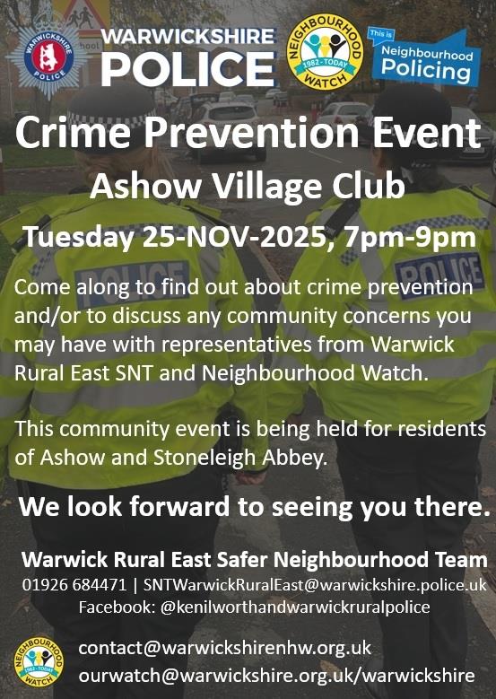 Dear Resident Warwick Rural East Safer Neighbourhood Team will be working in partnership with Warwickshire Neighbourhood Watch on Tuesday 25-NOV-2025 to provide a crime prevention event for persons in the Ashow and Stoneleigh Abbey area. Come along to find out how to keep your home/property safe. This event also provides you with the opportunity to discuss any concerns you may have. This is a drop-in style event, being held at Ashow Village Club between 7pm & 9pm on Tuesday 25-NOV-2025. Let us know what matters in your community! If you're unable to attend the event you can view crime prevention advice online Crime prevention advice | Warwickshire Police For more information about Neighbourhood Watch, visit Warwickshire | Neighbourhood Watch Network You can contact Warwickshire Neighbourhood Watch by email contact@warwickshirenhw.org.uk Regards, Warwick Rural East Safer Neighbourhood Team Dial: 01926 684471 | Email: SNTWarwickRuralEast@warwickshire.police.uk Facebook: @kenilworthandwarwickruralpolice | Website: www.warwickshire.police.uk | ||