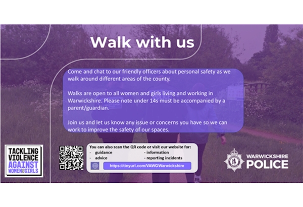 Stratford Walk with us will take place on: Date : Sunday 8th March Time : 3pm-4pm Location: Meeting outside Stratford Leisure Centre, Bridgeway, Stratford CV37 6YX This will be a different route to the last walk Dogs very welcome Come along to speak to us, meet your local team, or just come along for a great walk! This walk is approximately 2 miles, suitable for all and will finish back at the start. ** This event is for all Women and girls, who live and work in Warwickshire** Under 14's must be accompanied by a parent or guardian. We will also be supplying some personal safety products; we look forward to meeting you